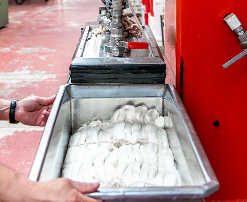Qui un’addetta provvederà a avvolgere sull’aspo il filato ritorto. Alla fine, ogni singola matassa verrà pantimata, piegata e confezionata in pacchi, tradizionalmente di 5 kg. per 28 matasse. Il diametro della matassa, la grammatura, la lunghetta e la cappiatura (numero pantimi e passaggi) sono a richiesta del cliente finale.